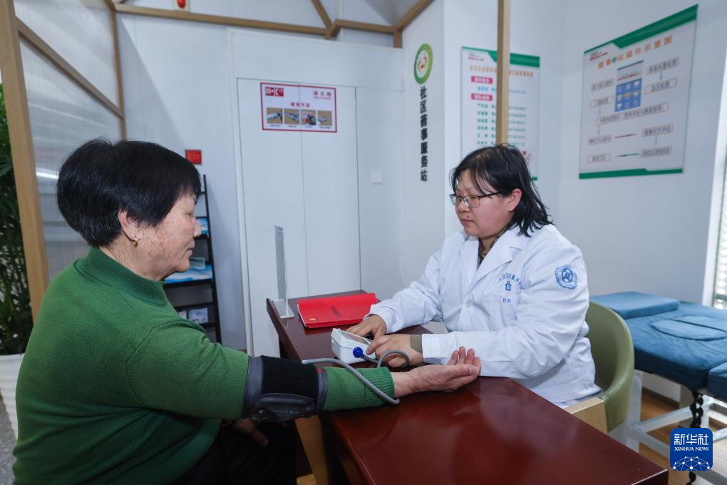 7日4月,道金都美地社区党群办事核心正在浙江省金华市金东区多湖街,燕娜给83岁的社区白叟杜宝英量血压多湖街道社区卫生办事核心公卫医师钱。