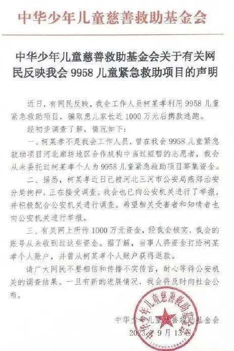 日晚13,合于相合网民反响我会9958儿童殷切救帮项宗旨声明》中华儿慈会官方微博颁布《中华少年儿童慈善救帮基金会,如下实质: