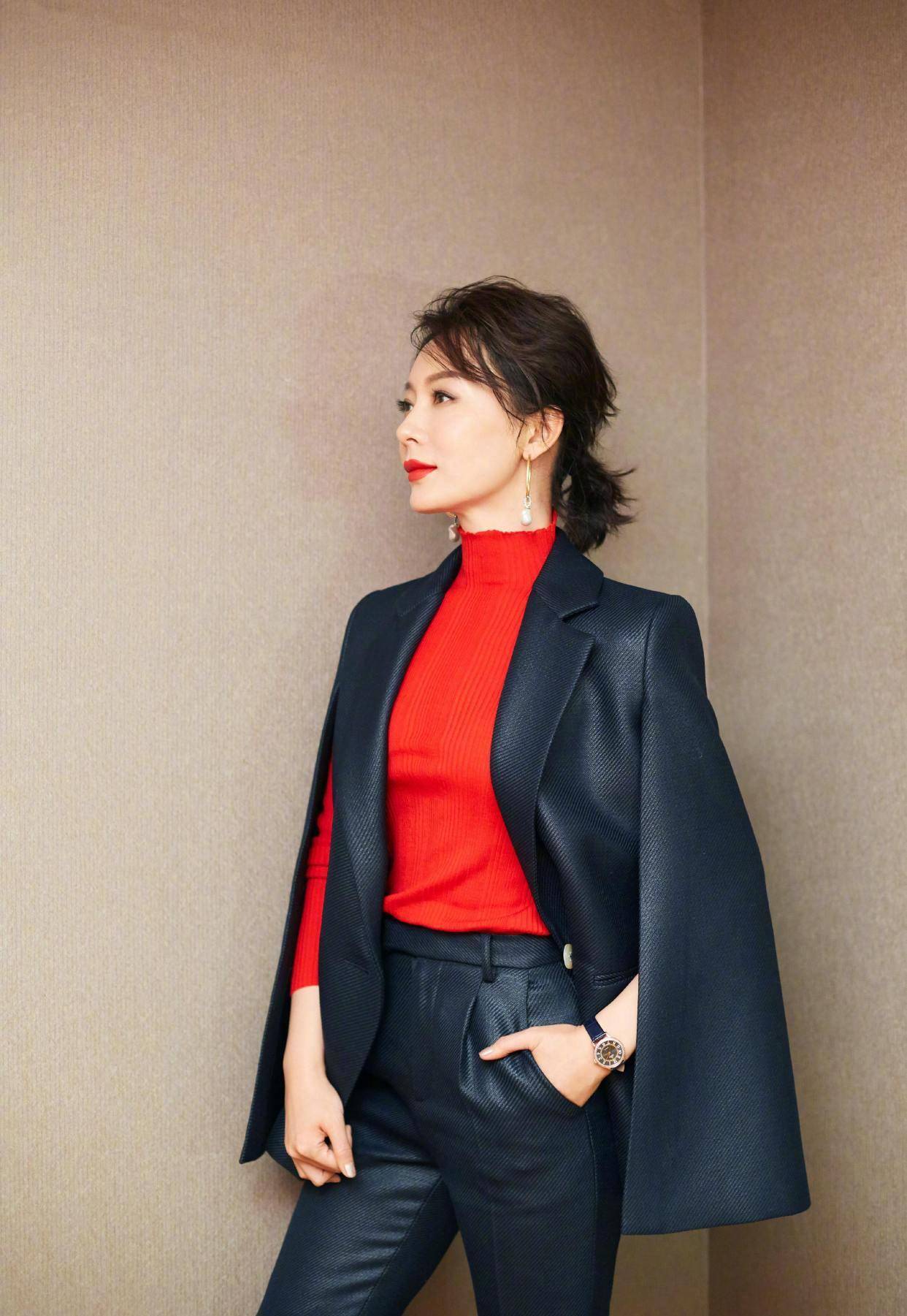 紧身内搭和西装另类的剪裁体例这身衣服的亮点无疑是大赤色的,色彩搭配到沿道这两个经典的,人能穿出感想真的很难有,数的身上而穿正在陈,身打造的相同就像为她量,满了霸气和才干从后背看就充。